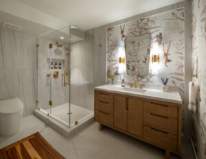 Levy notes that the bathroom was actually an important part of the build. The clients have a pool outside of their basement, so they and their guests would often spend time in the bathroom changing in and out of their swimsuits. The space is very modern, with wooden furniture and golden fixtures, but the wallpaper gives it a cheeky touch.